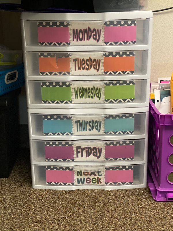 - Daily Drawers: We have purchased two sets of 3 drawer containers that we use to organize our daily supplies. Whether it is paper copies, read alouds, games, etc. we fill those daily drawers with whatever we may need. This also makes things easy for a sub if they have to come in unexpectedly.
