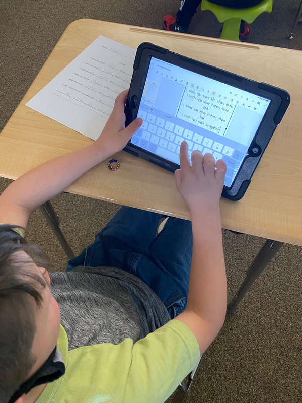 As a final project to showcase their learning, students listened to the book I Wish You More by Amy Krouse Rosenthal. This book was great text to introduce and teach students about synonyms and antonyms. Students created their own poems based on the work of Rosenthal. They used Google Slides to type their final drafts. Students loved the freedom to use different fonts and sizes. Next, students used PicCollage to create an image of them blowing a wish from a seeded dandelion. One student had the idea to put their wishes in small print and blow them away like the seeds. At the end of the week, we held a poetry reading for our students. Students walked in after lunch to candlelit tables with fancy plates filled with goodies to snack on as they enjoyed the reading of their peer’s poems. The best part was to teach students to snap instead of clap when one’s reading was finished.